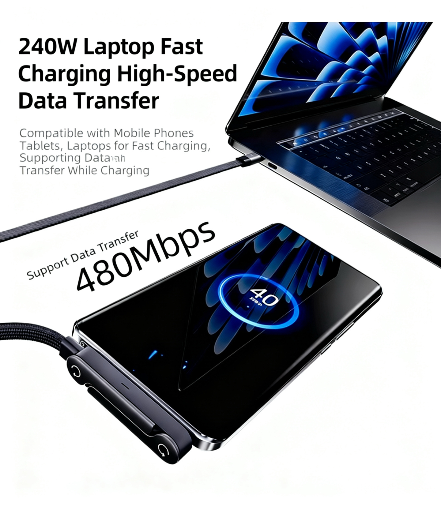 · 240W fast charging, compatible with laptops, tablets, and smartphones