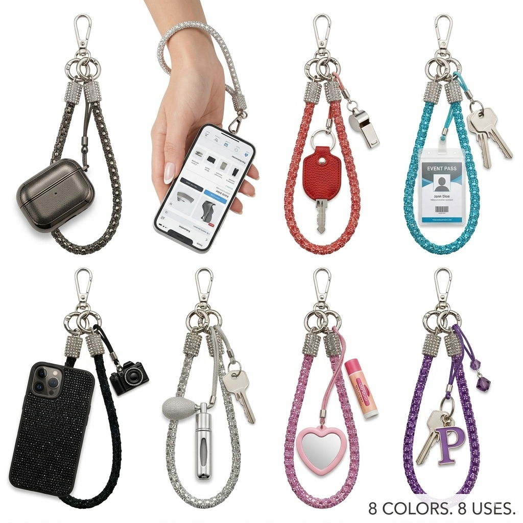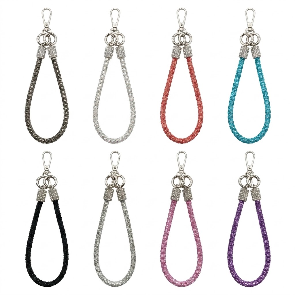 Structural Integrity (结构设计): Engineered with a high-density core and precision-set crystals. Featuring a heavy-duty zinc alloy clasp for 360° rotation and secure attachment to any mobile device or key set. 采用高密度绳芯与精密镶钻工艺。配备高强度锌合金锁扣,支持 360° 旋转,确保手机或钥匙组的稳固连接。